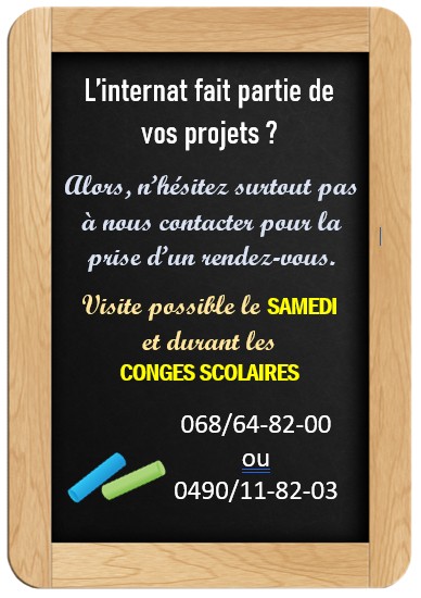 Nos internes du secondaire ont la possibilité de suivre les cours à Houtaing (enseignement général) ou à Lessines (enseignement technique de qualification en gestion et enseignement professionnel en cuisine de collectivité).